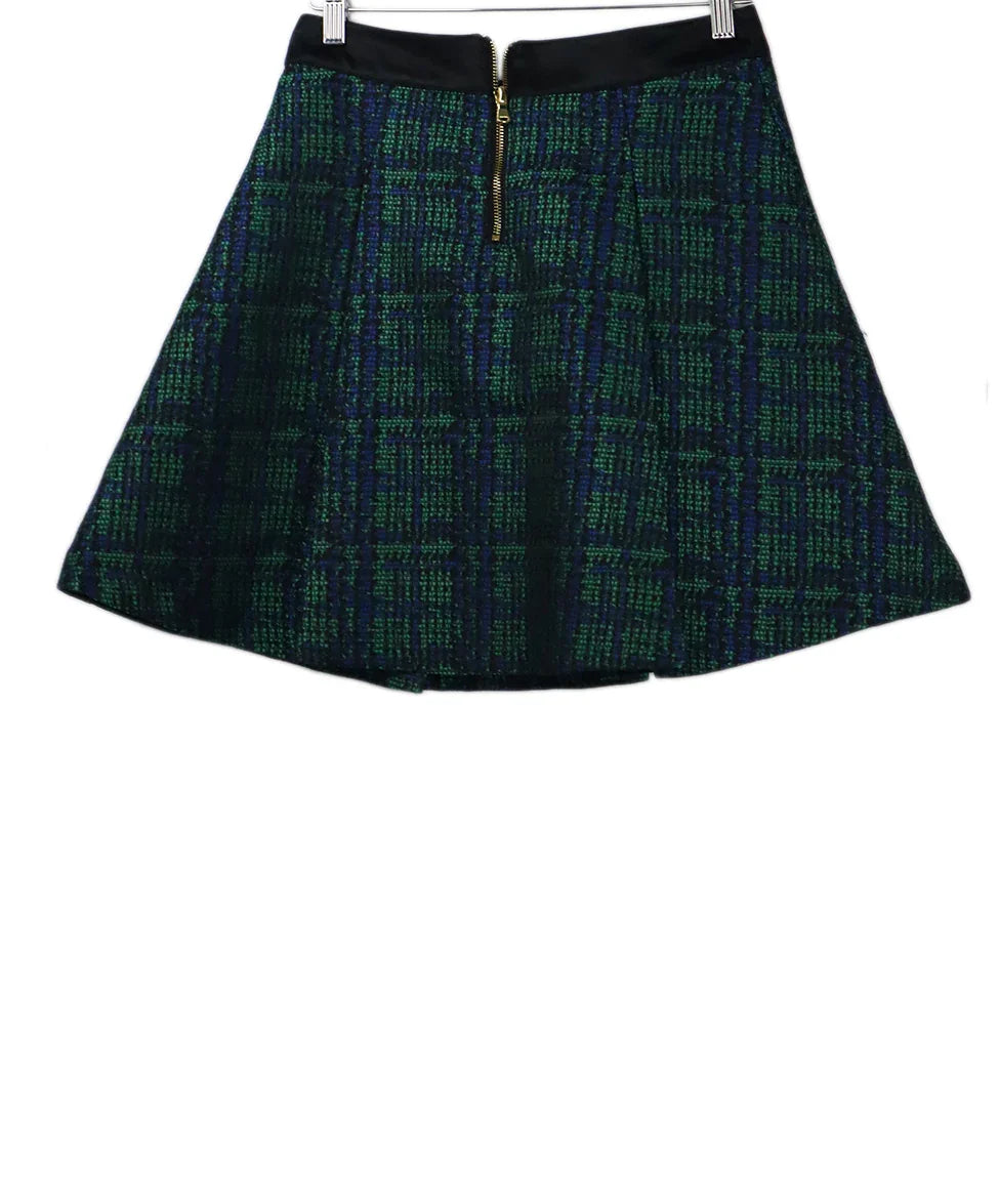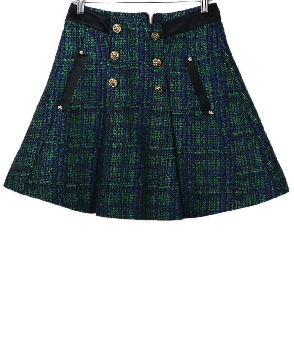 Balmain Green Blue Black Plaid Polyester Mini Skirt with Gold Buttons sz 2