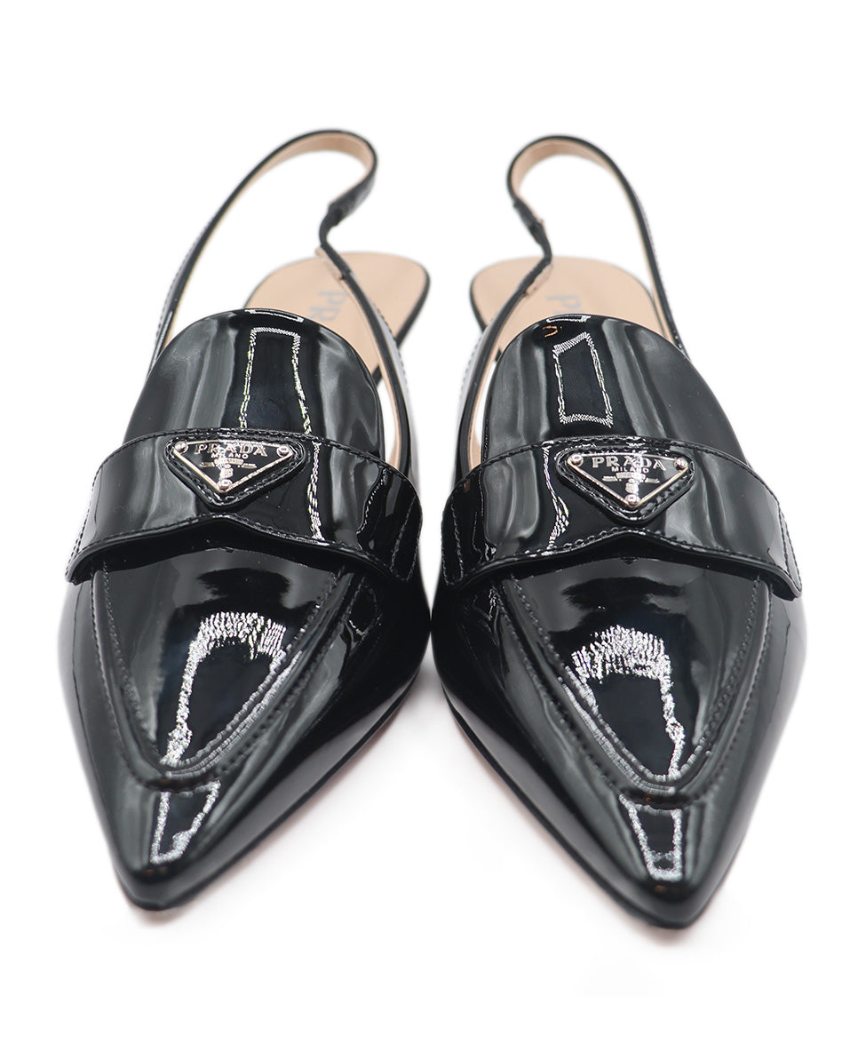 Black patent leather slingbacks in size 7. Sleek kitten heels with refined sling-back design. A versatile luxury essential combining understated sophistication with wearable comfort.