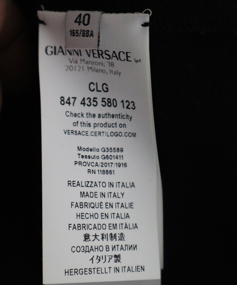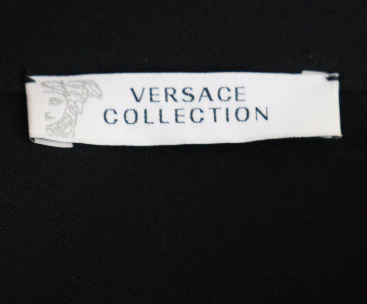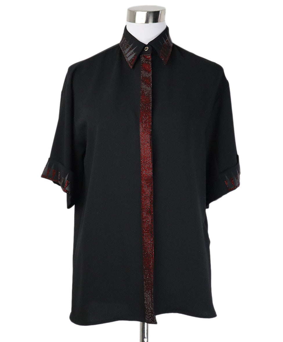 This Versace top showcases Italian luxury in black polyester, accented with the house's signature red crystal trim. Size 4. A sophisticated statement piece that combines designer prestige with refined elegance.