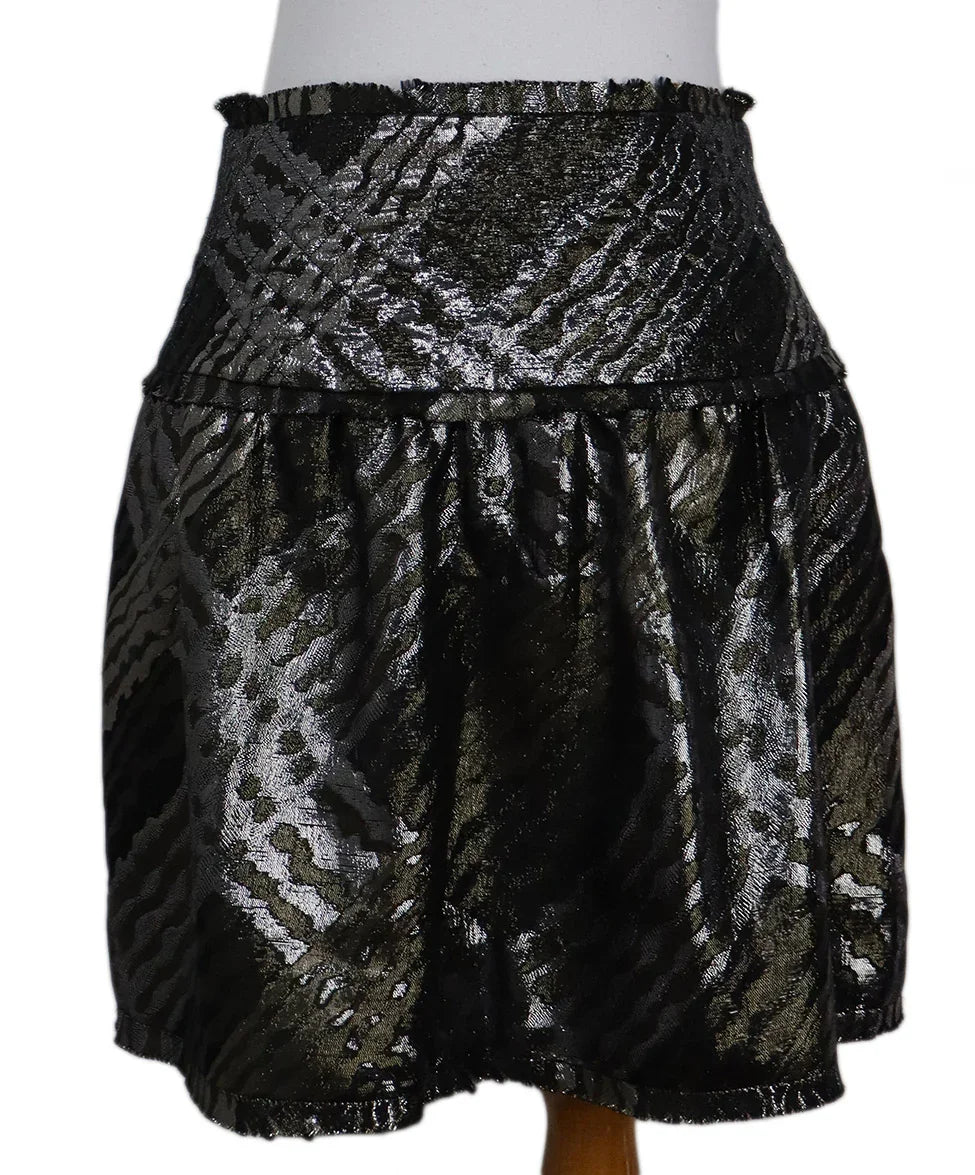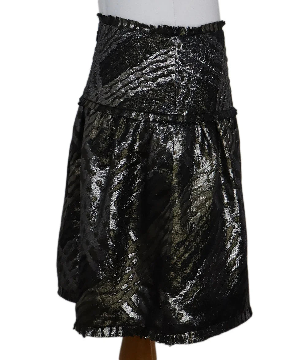 Add dazzling flair to your collection with this Chanel metallic skirt. Crafted from luxurious silk and polyester blend with a shimmering pewter metallic finish, it catches the light with every movement. The expertly tailored silhouette ensures a polished fit, making it ideal for glamorous events or standout everyday style. This skirt perfectly combines sophisticated design with eye-catching sparkle for a truly captivating look.