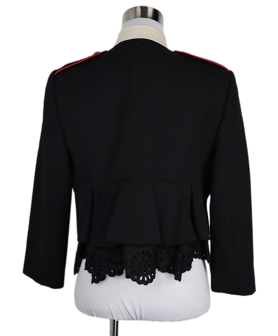 This Alexander McQueen blazer in size 4 commands attention with its striking black, red, and white colorway and intricate eyelet trim detailing. The bold color blocking showcases the designer's signature dramatic aesthetic while the delicate eyelet work adds refined texture. Perfect for making a statement at any occasion, it pairs beautifully with neutrals or coordinates with complementary pieces.