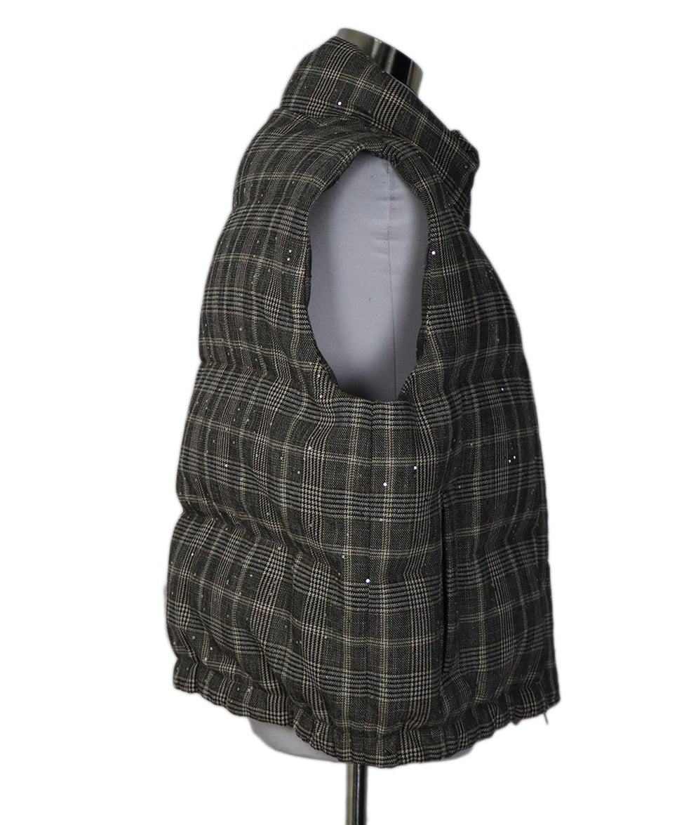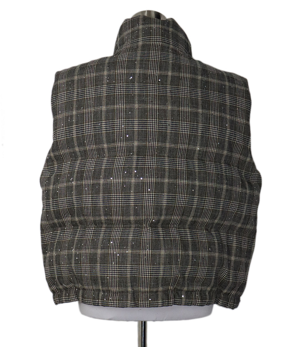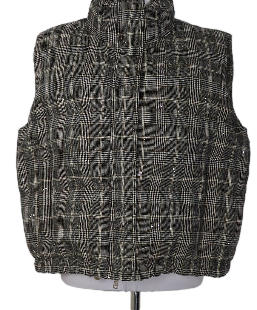 Brunello Cucinelli Neutral Beige Black Plaid Wool Sequins Vest sz 14
