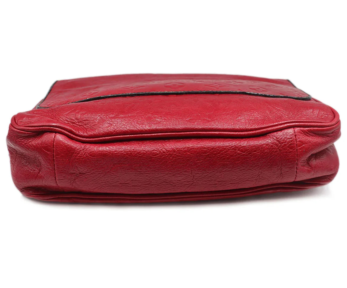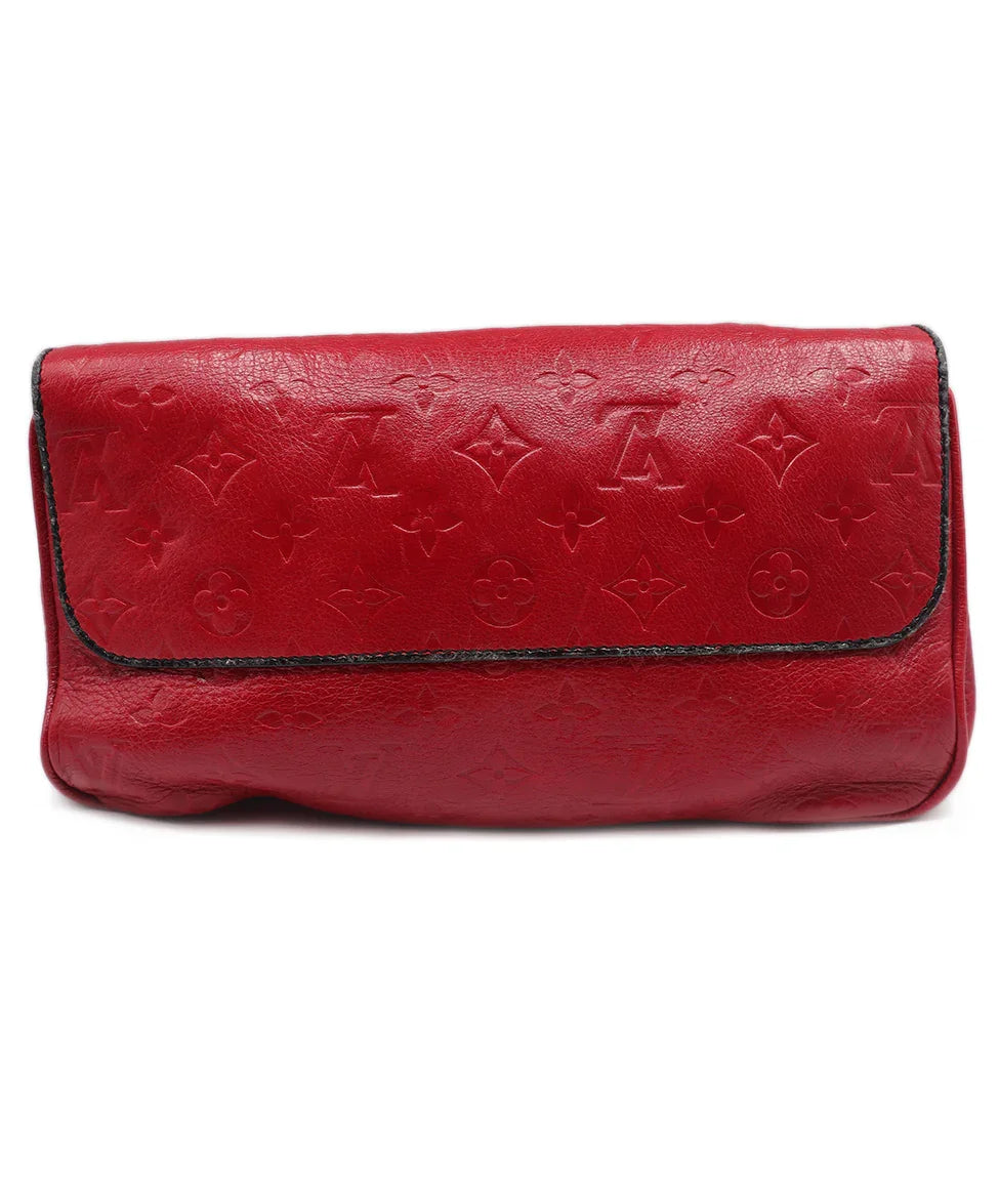 Louis Vuitton clutch in rich red leather with signature gold-tone lock hardware and trim. Compact silhouette perfect for evenings or as a statement carryall. Bold color makes an impact without trying too hard. Refined edge that works with everything from casual to formal.