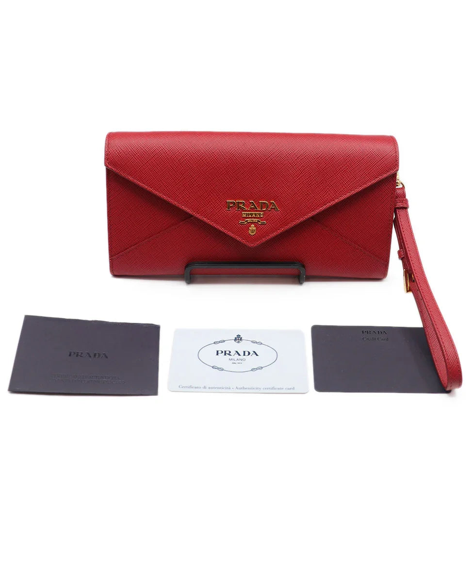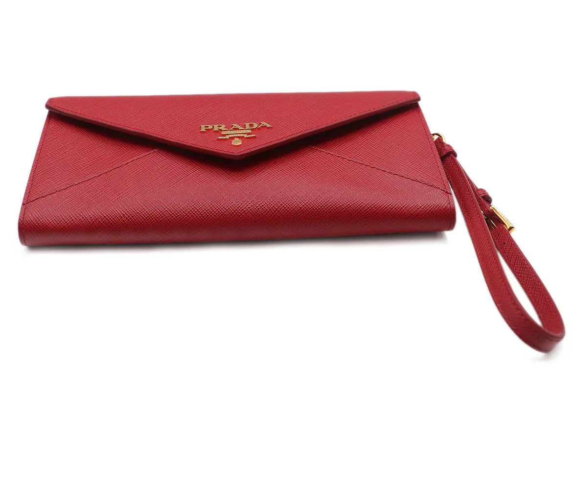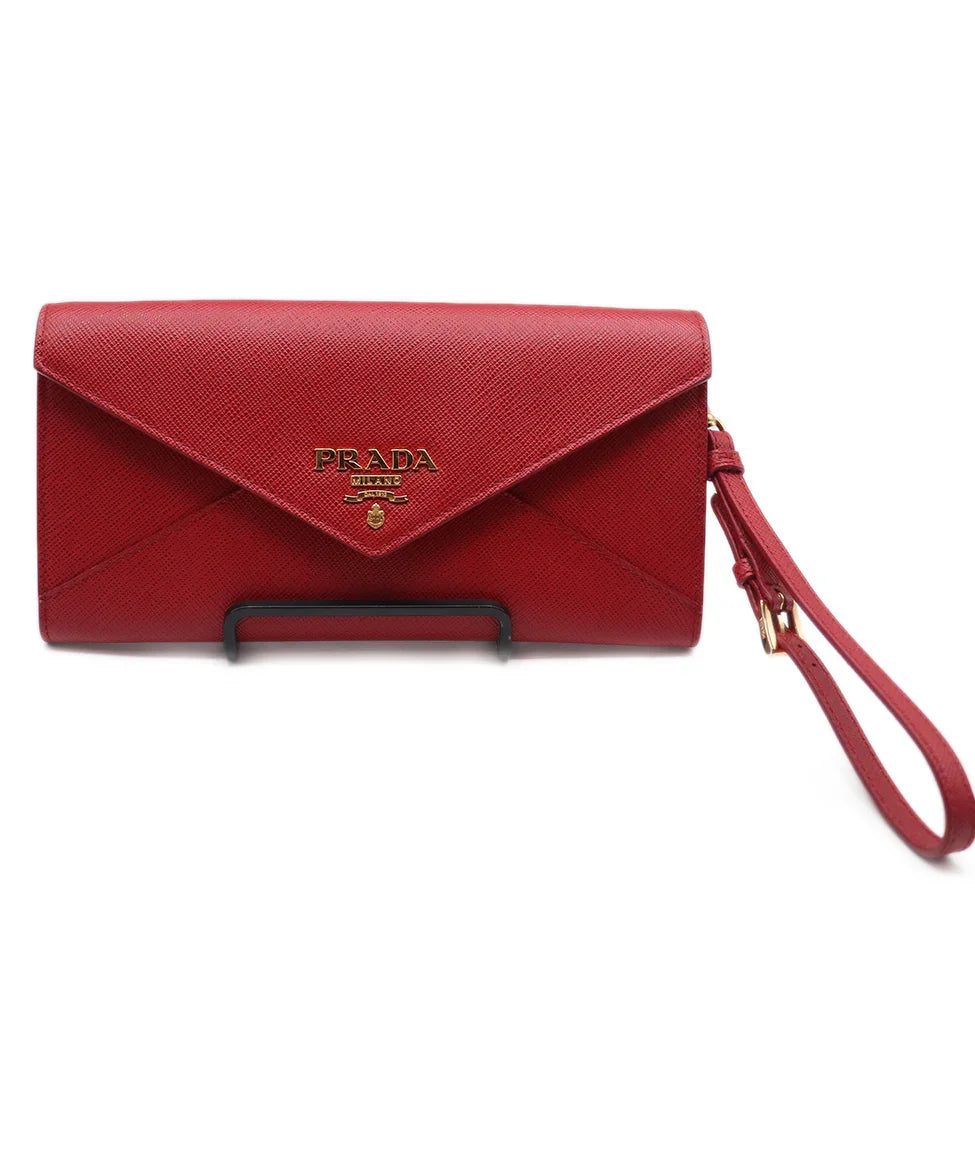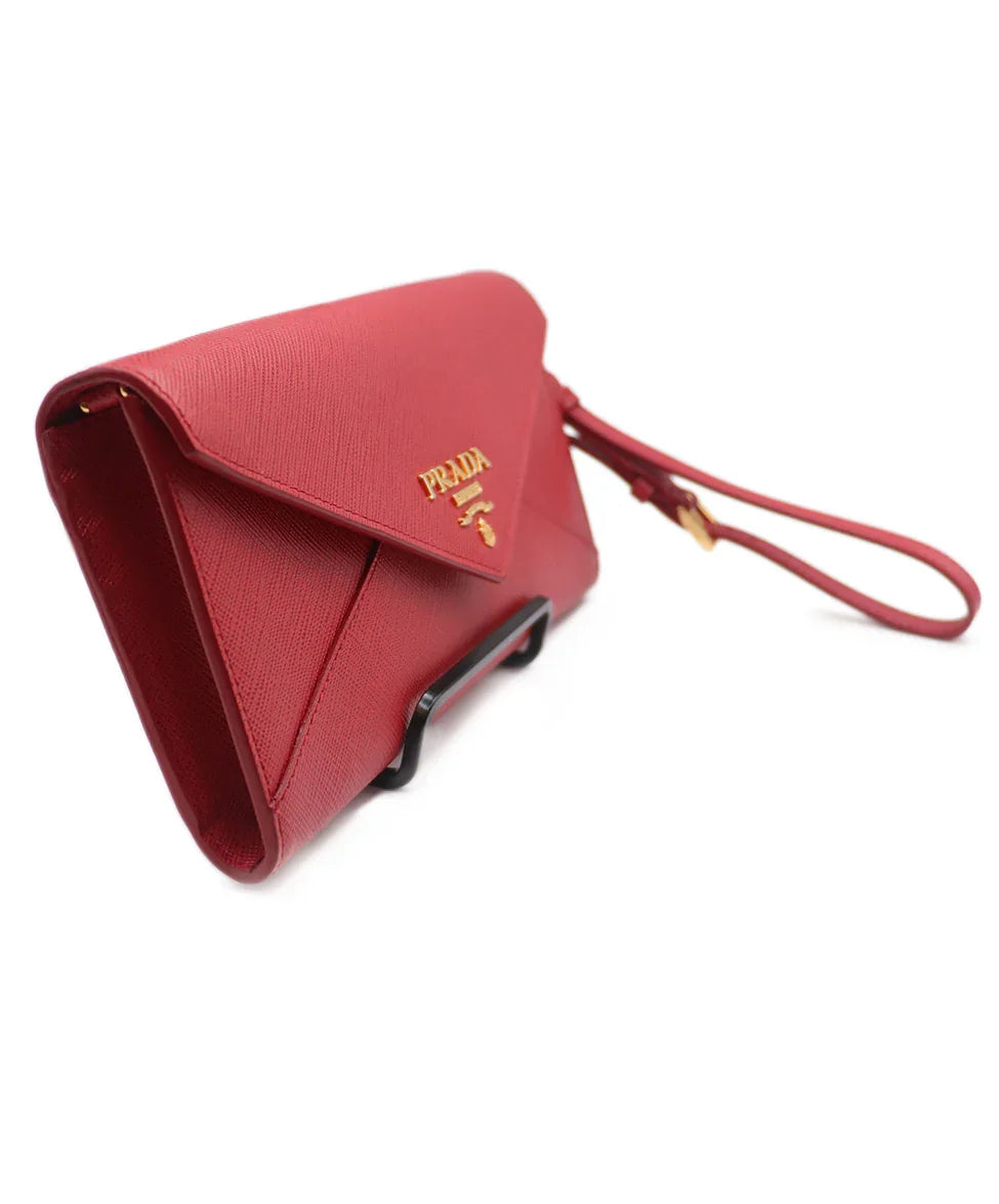 Authentic Prada wristlet crafted from signature red saffiano leather, renowned for its durability and refined texture. The structured design accommodates essentials while maintaining an elegant silhouette suitable for evening occasions or as a sophisticated everyday accent.
