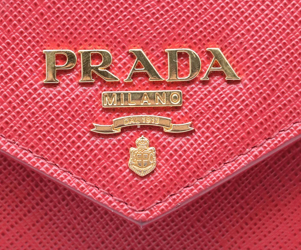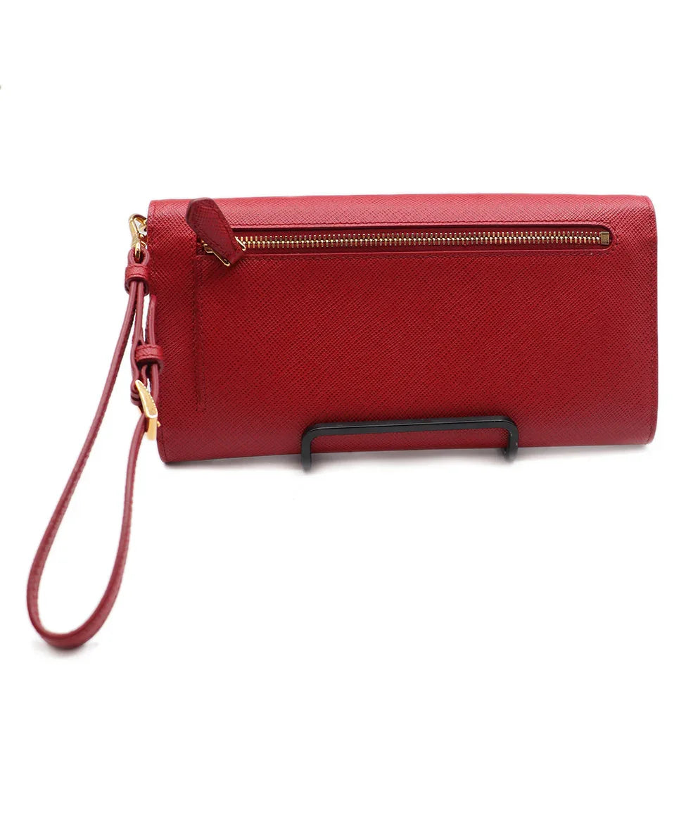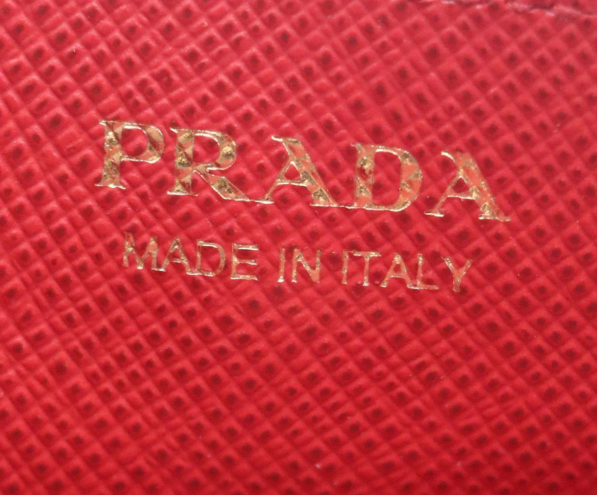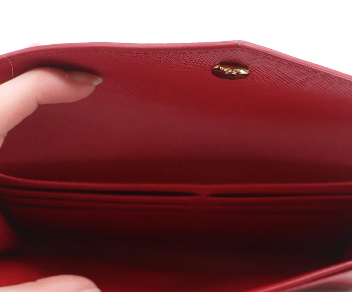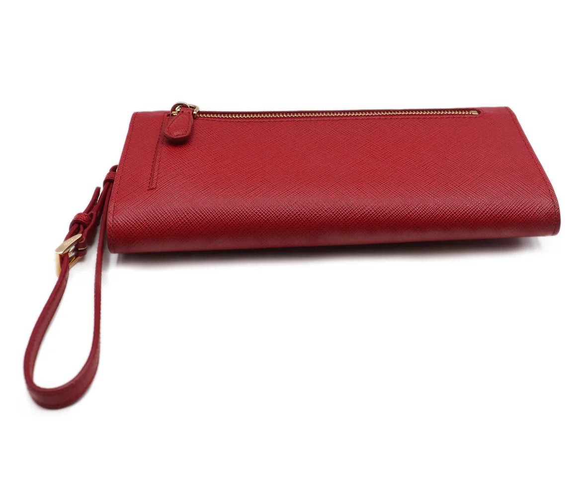 Authentic Prada wristlet crafted from signature red saffiano leather, renowned for its durability and refined texture. The structured design accommodates essentials while maintaining an elegant silhouette suitable for evening occasions or as a sophisticated everyday accent.