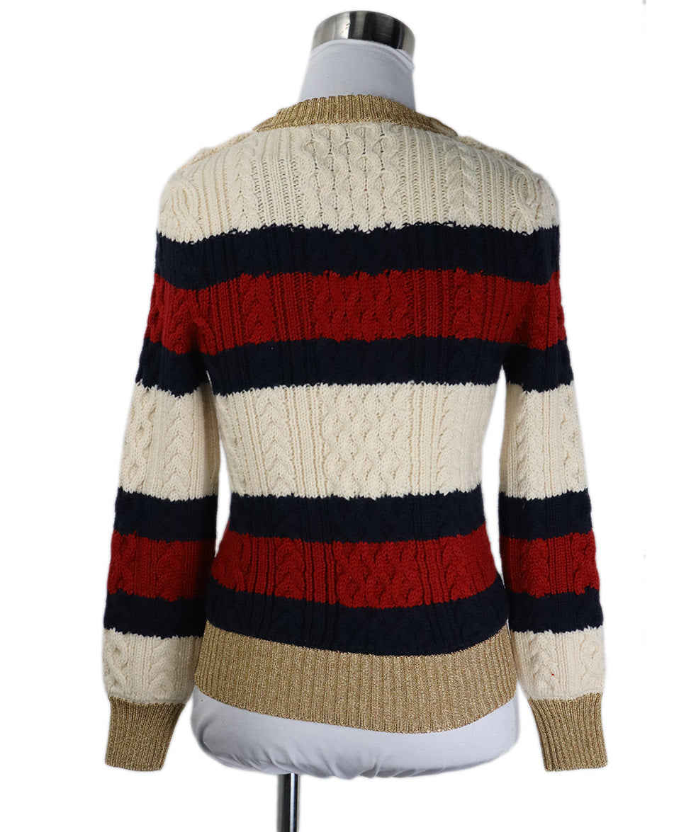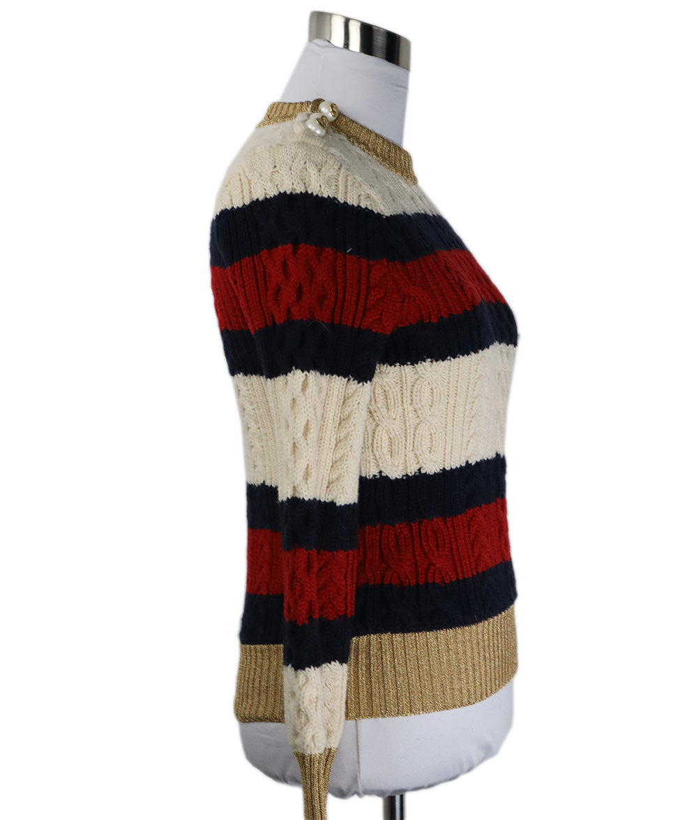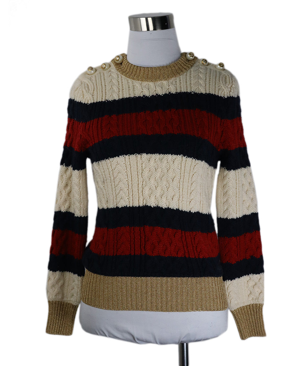 Gucci Crewneck Red Ivory Navy Striped Cableknit Wool Sweater with Gold Pearl Buttons sz 2
