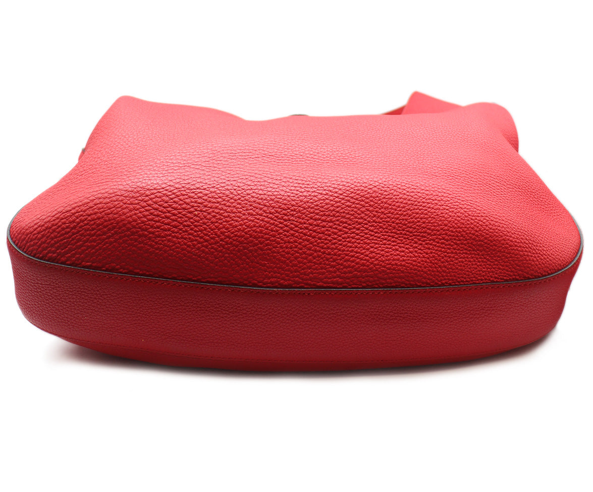 This stunning Gucci hobo handbag showcases rich red grained leather with polished silver hardware for a sophisticated look. Includes a convenient accessory pouch for organized storage. An investment piece that combines Italian craftsmanship with contemporary style.