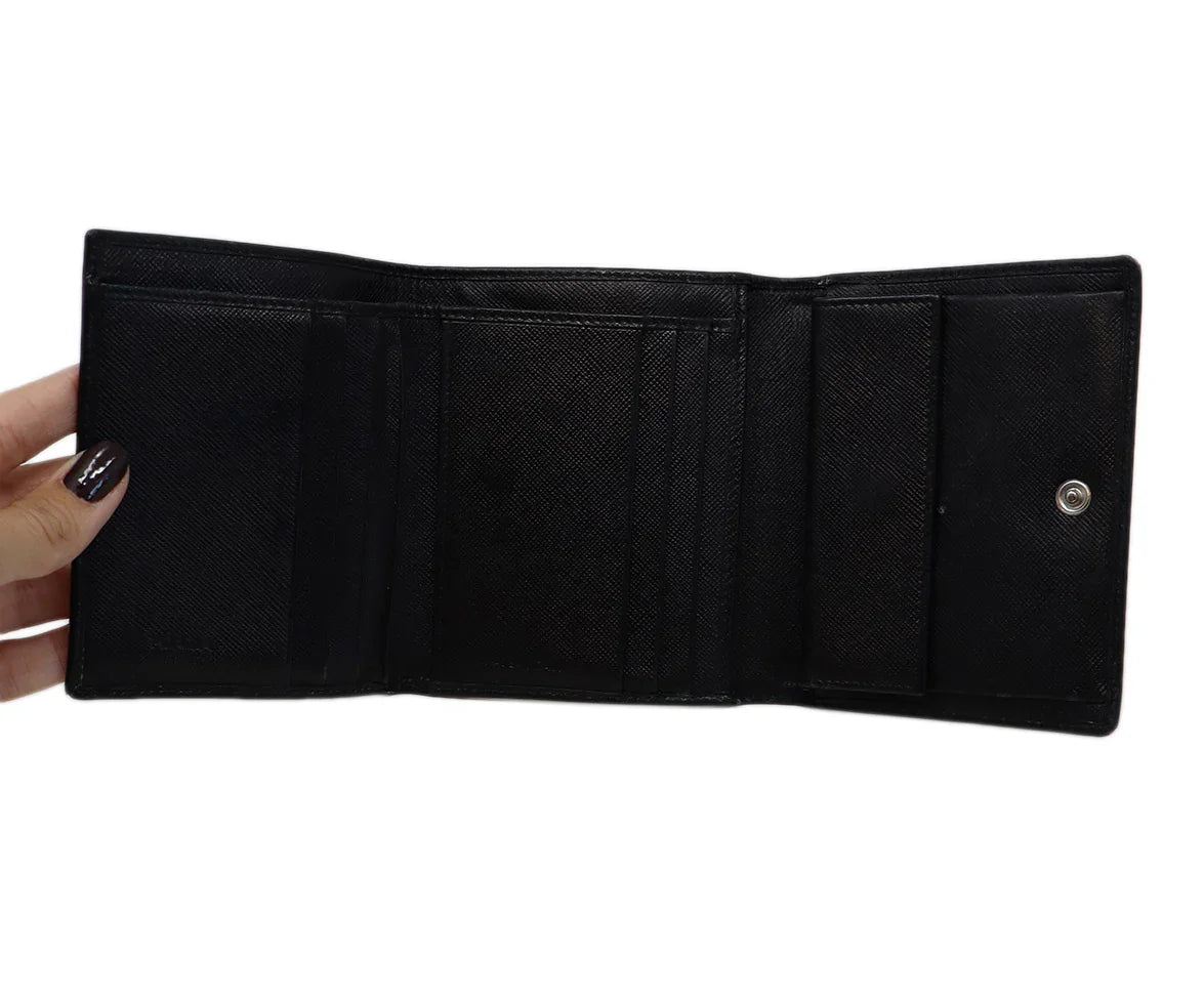 The Prada Black Leather Wallet offers a classic, minimal design crafted from smooth leather. Compact and functional, it’s an expert choice for keeping essentials organized with understated style.