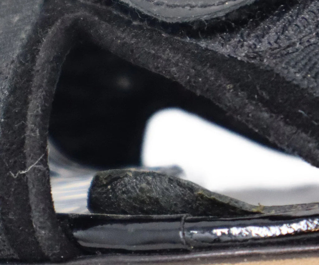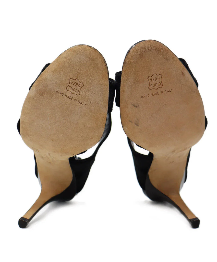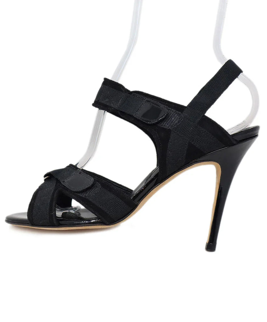 These Manolo black sandals in size 8 offer a pretty and refined look. Crafted from luxurious faille fabric and patent leather, they combine subtle texture with elegant design, making them a sophisticated choice for both formal and stylish everyday wear.