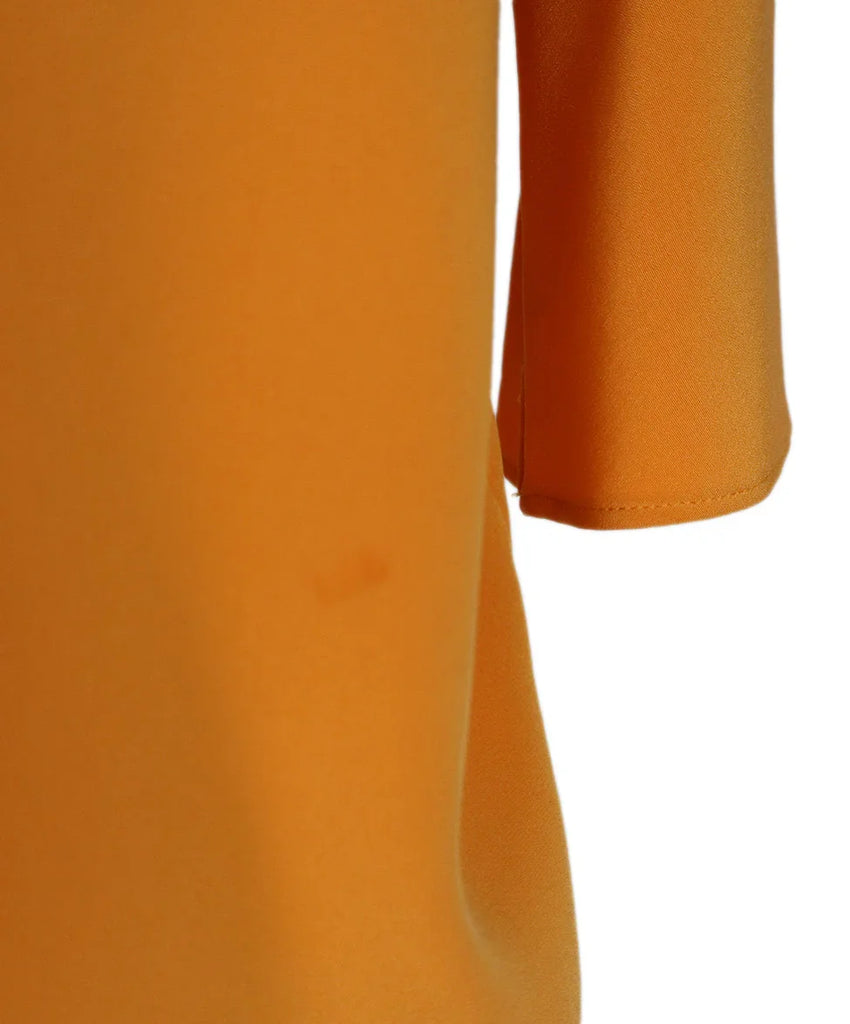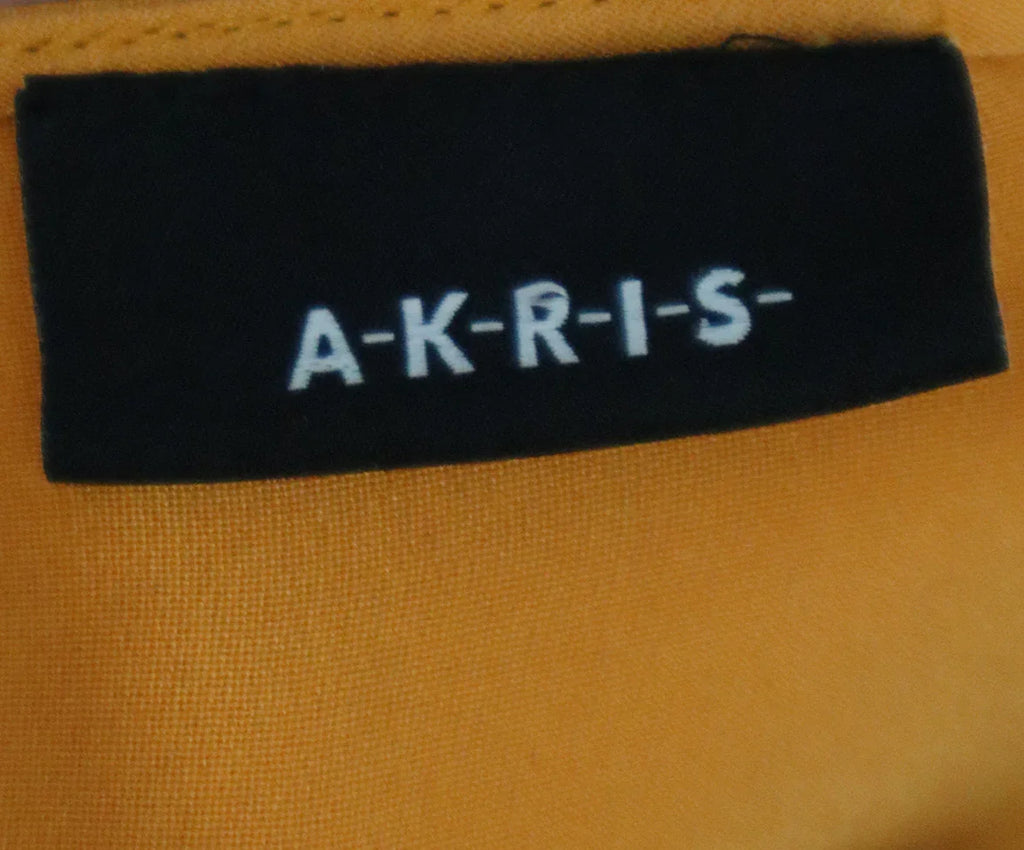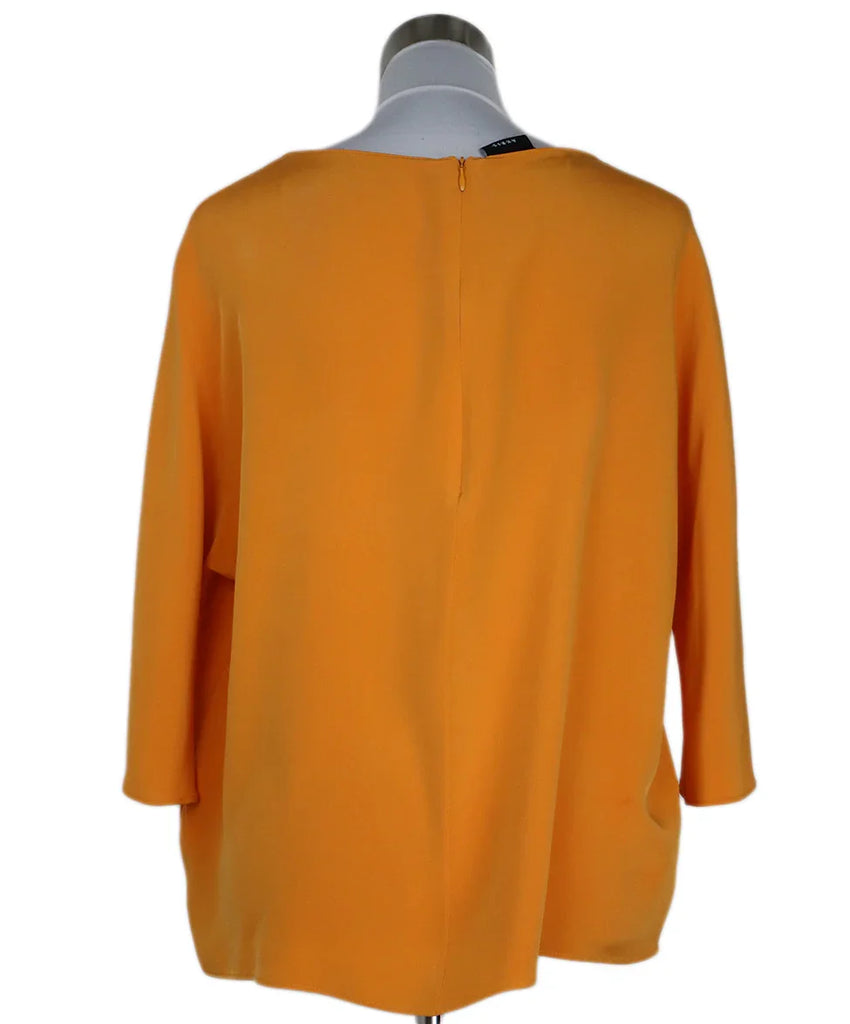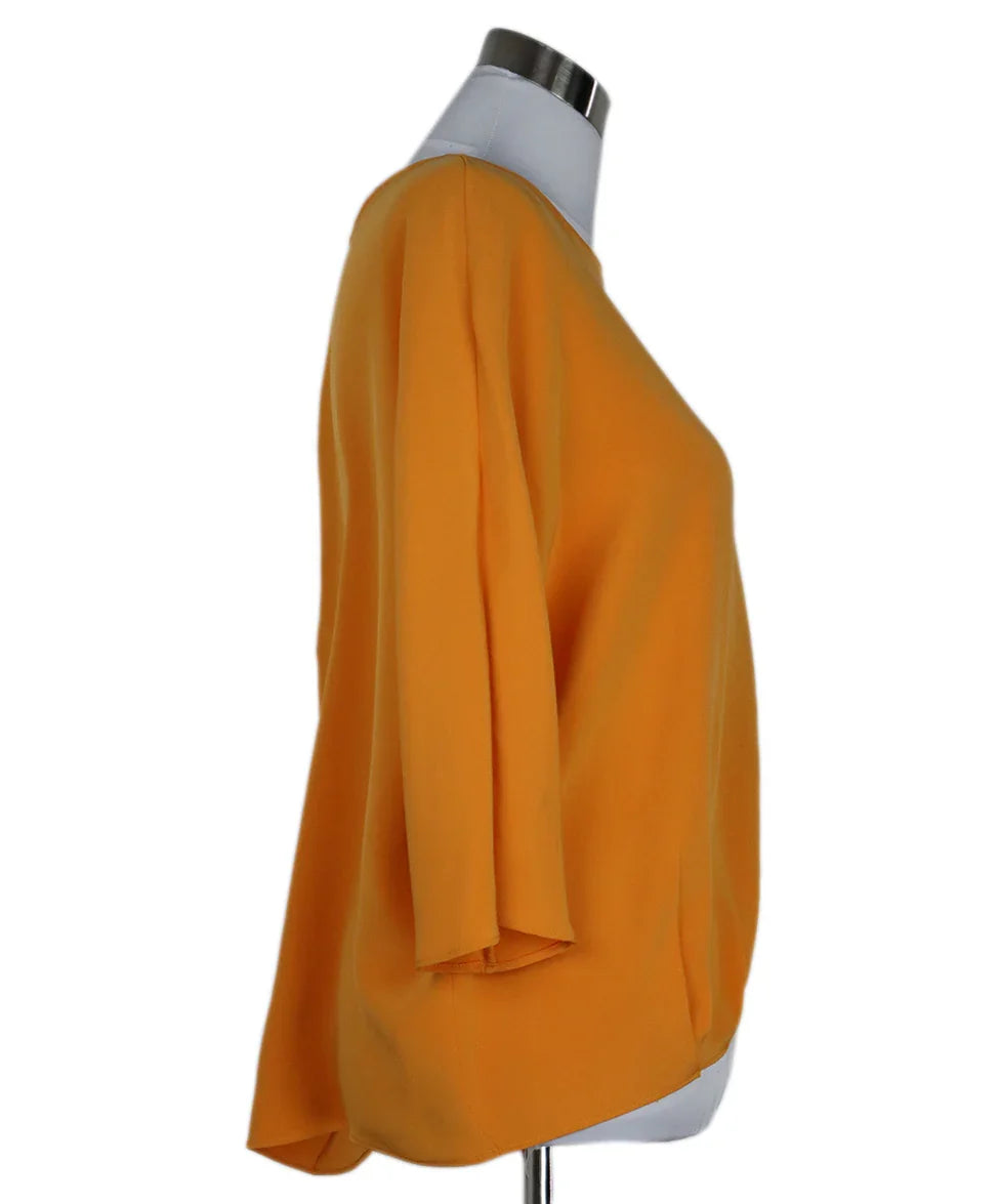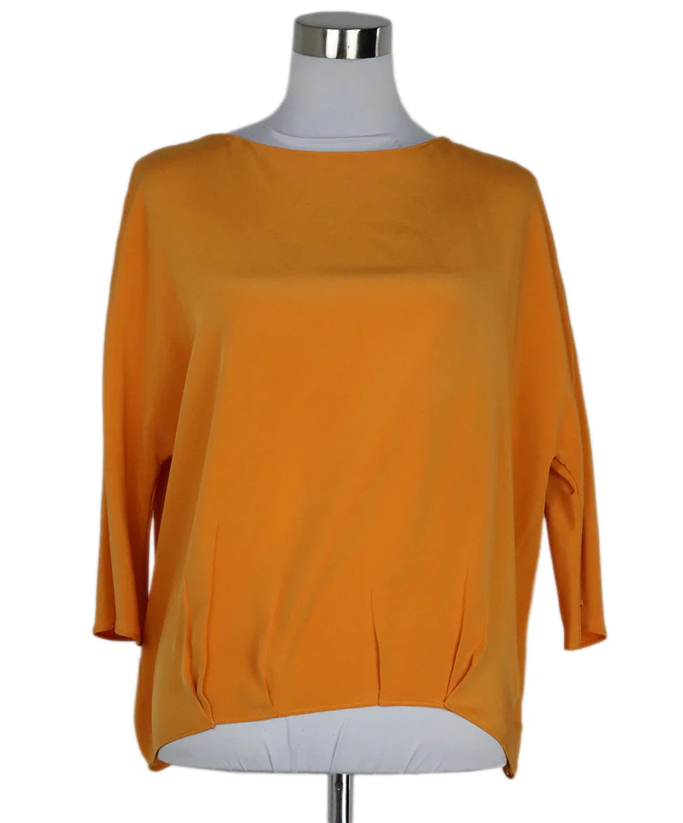 This Akris blouse in size 8 features a classic minimal design crafted from luxurious orange silk. Its clean lines and expert tailoring offer a refined, versatile piece that adds a subtle pop of color to any wardrobe.