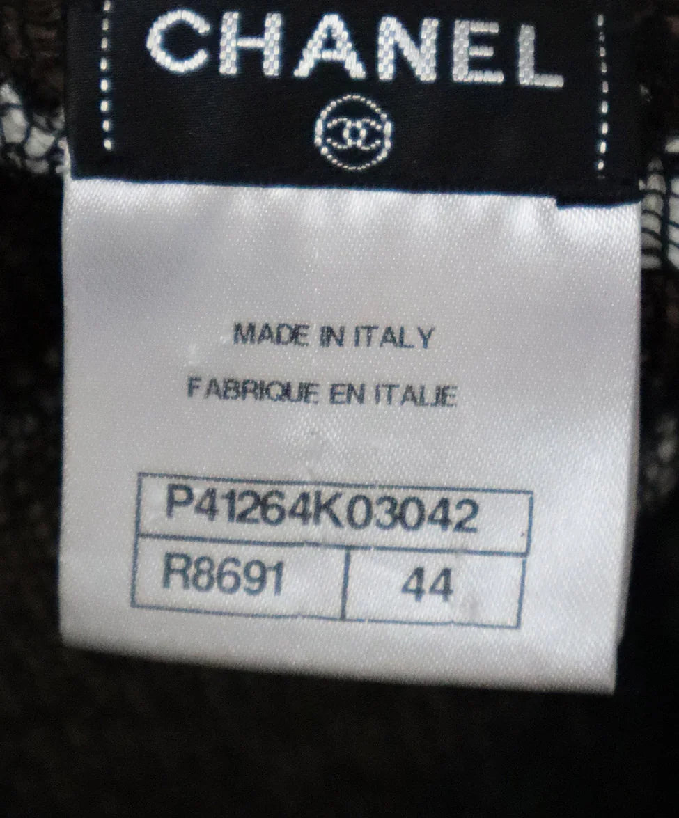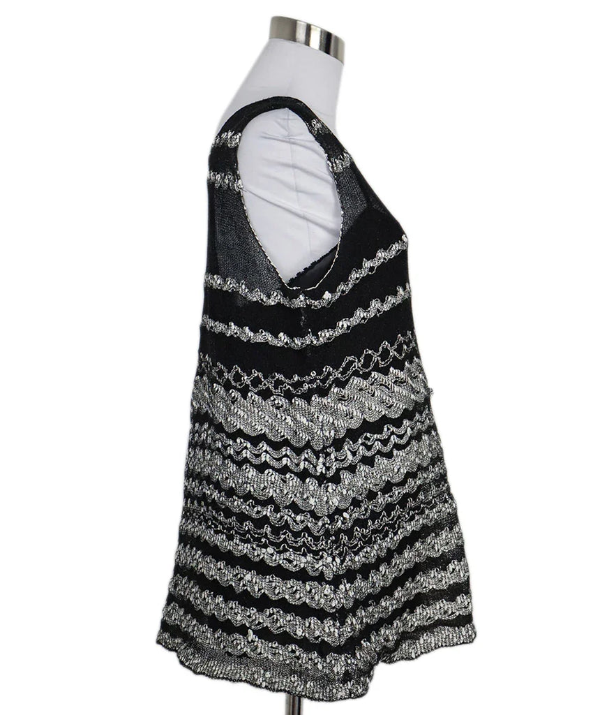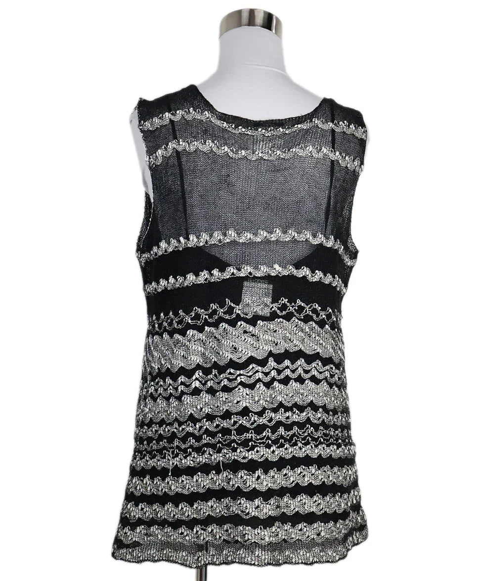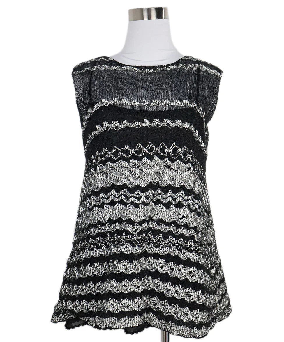 This Chanel black and white knit sleeveless top in size 10 features a minimalist design enhanced with subtle sequins. Its classic silhouette offers effortless elegance, making it a versatile piece for layering or wearing alone in warmer weather.