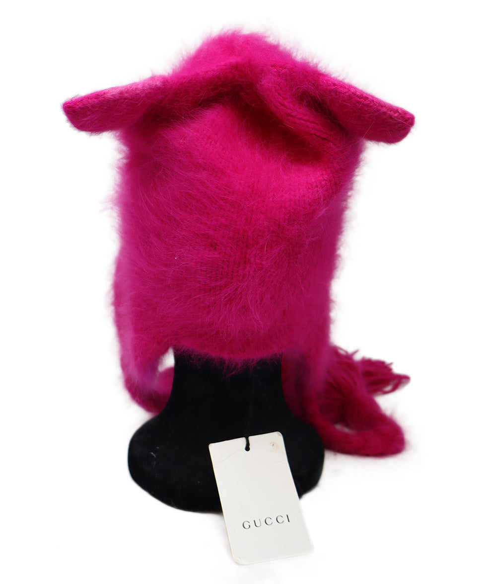 This Gucci wool hat makes a bold statement with its vibrant fuchsia hue and distinctive long tassels. The playful ear design adds personality while the embroidered detailing showcases expert craftsmanship. Warm wool construction keeps you cozy through winter, and the eye-catching style ensures you'll stand out. Perfect for anyone who refuses to blend in when the temperature drops.